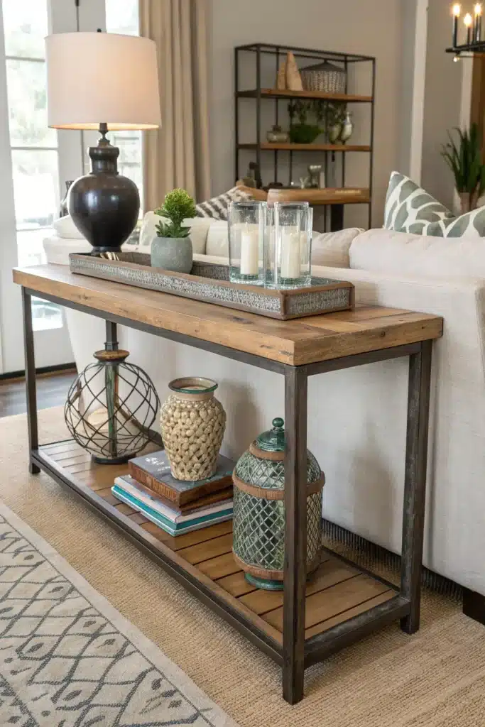 While symmetry has its place, asymmetrical styling often feels more modern and natural in open-concept homes. Try anchoring one side of the sofa table with a lamp or plant, then balancing the other side with lower objects like books or bowls.