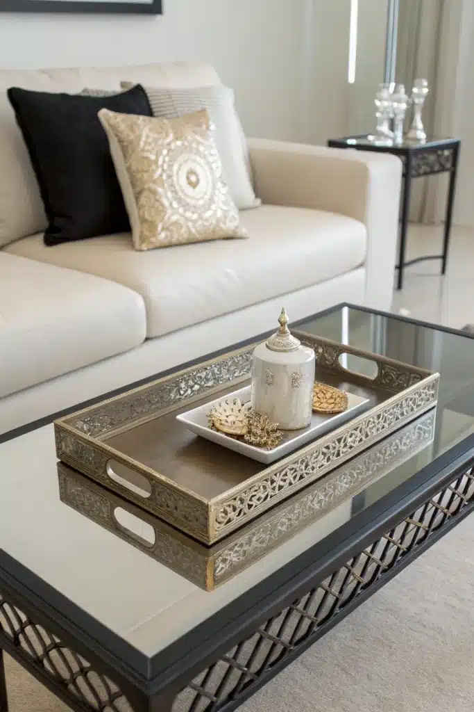 Place a tray in the center and arrange items like candles, books, or a small vase within it. The tray creates a defined “moment” that holds its own in a spacious layout and keeps everything looking intentional.