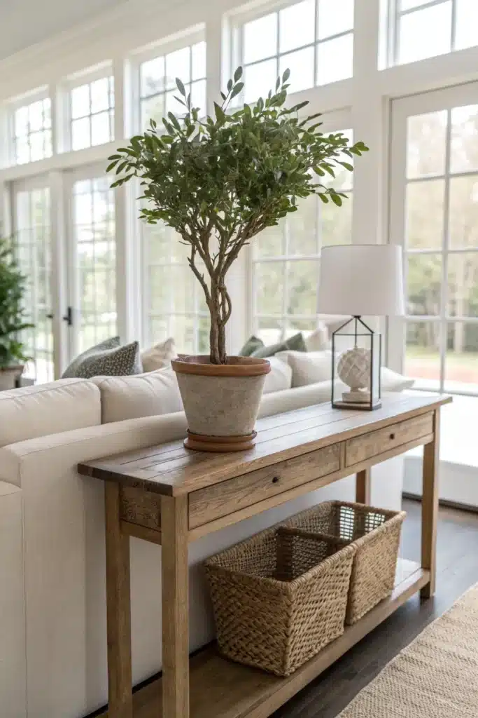 Woven baskets can hold throw blankets, board games, or kids’ toys while adding warmth and texture. Choose baskets that fit the width of the table neatly so the area looks styled rather than stuffed. This keeps your living room tidy without sacrificing accessibility.