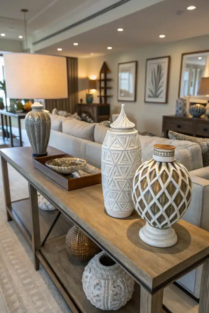 In homes where the living room blends into entry or dining areas, a sofa table can double as a practical landing spot. Use trays to corral keys, mail, or remotes, and add a small decorative box for items you want out of sight.