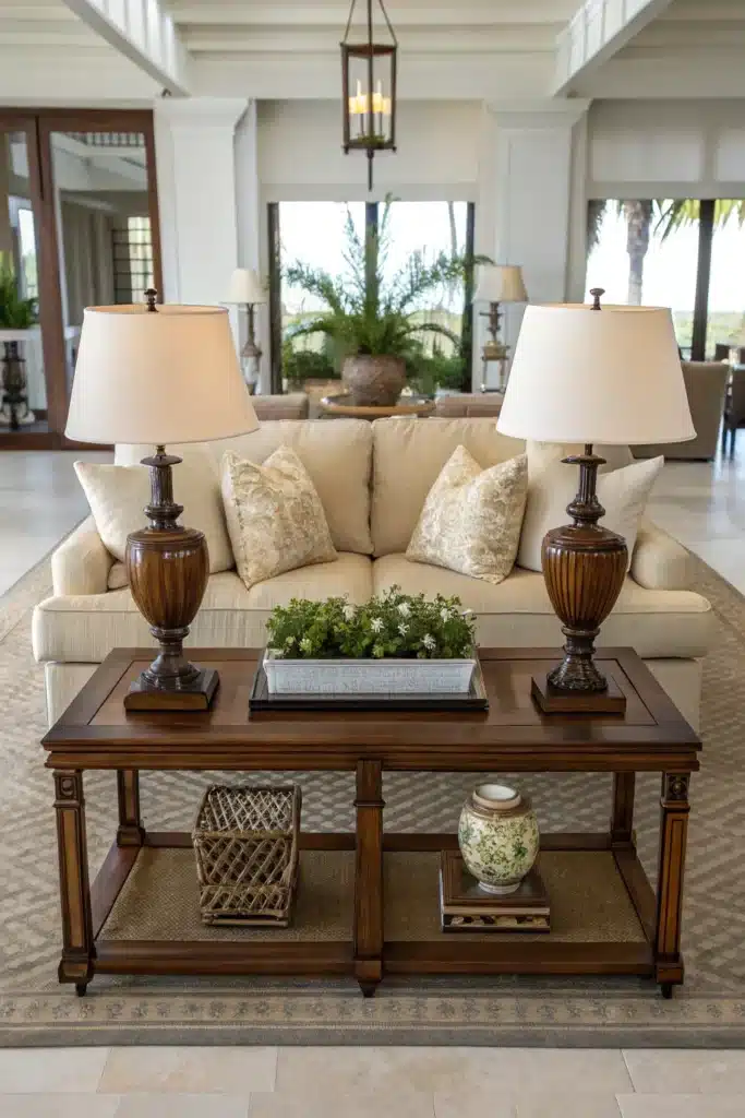 Symmetry brings instant calm, especially in large, open rooms. Placing matching table lamps on either end of a sofa table adds balance and gives the living room a grounded, intentional feel.