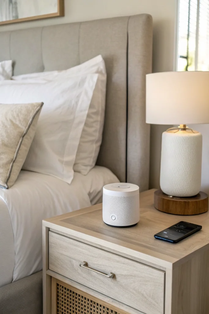In a modern bedroom, white noise can be incorporated discreetly through smart speakers, bedside devices, or built-in systems. The steady, neutral sound blends with the room’s acoustic design, creating a controlled sound environment that supports uninterrupted rest.