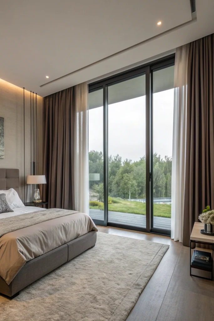In modern bedrooms, curtains are often hung high and wide, making ceilings appear taller while fully covering windows. Neutral tones, soft folds, and minimal hardware keep the look clean and contemporary, while the added sound insulation supports deeper sleep.