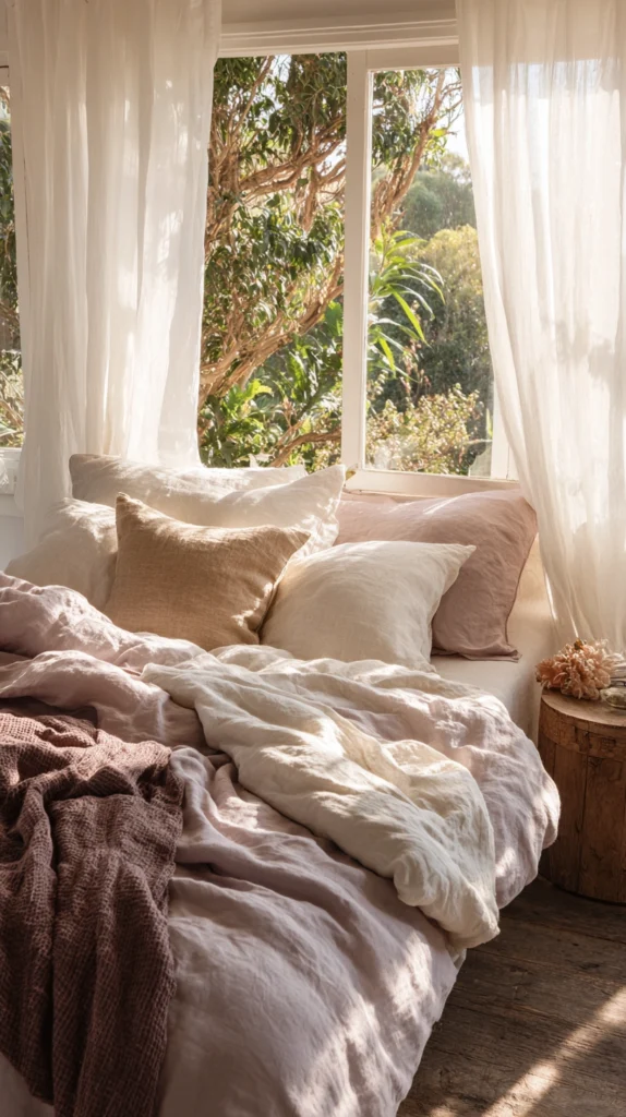 Choose curtains that hang floor to ceiling and pool very slightly on the ground for a romantic, unhurried effect. If privacy is a concern, layer them over simple white roller blinds. The practicality disappears; only the beauty remains visible.