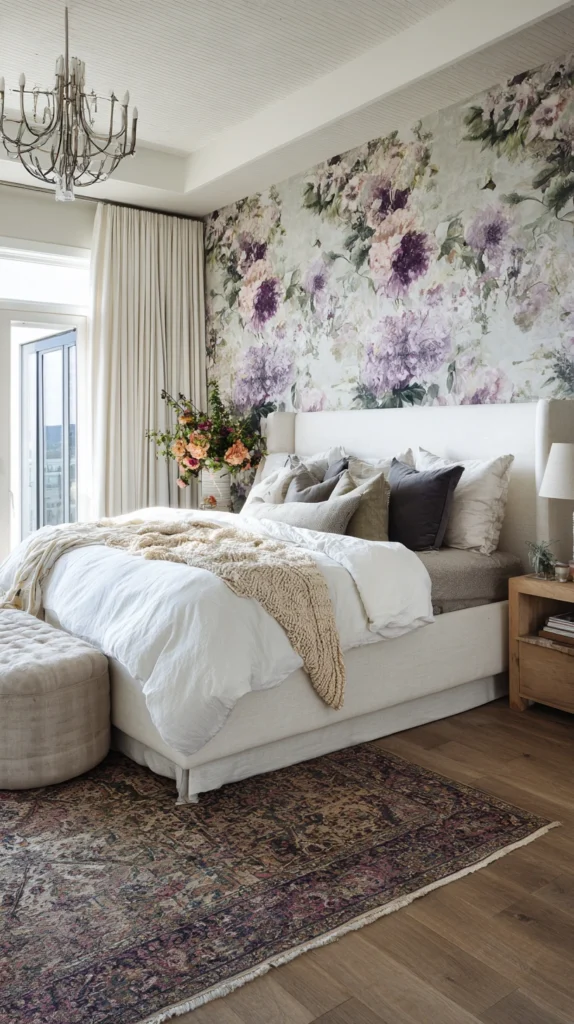 For those who like their spring bedrooms to make a genuine statement, a large-scale floral wallpaper featuring lavender blossoms is a spectacular choice. This is not a timid idea — it requires confidence and commitment — but when executed well, it transforms a bedroom into something that feels cinematic.
