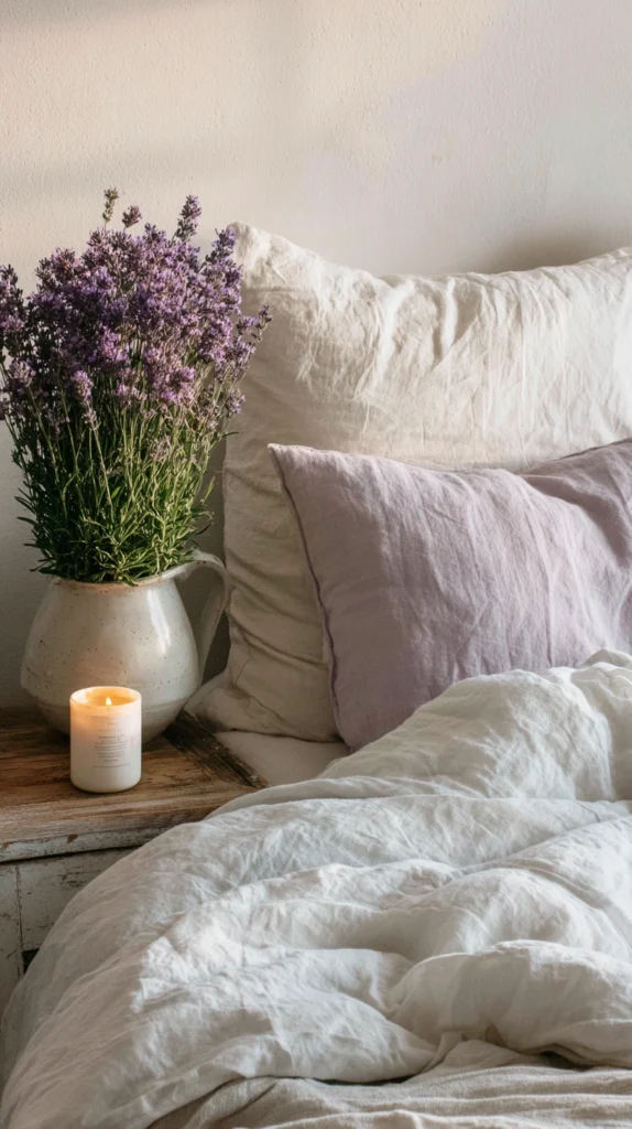 Bedroom decor extends beyond what you can see — scent is a fundamental part of how a space feels. Placing lavender-scented candles in simple ceramic or concrete vessels on your bedside table or dresser is one of those small decisions that has an outsized impact on the atmosphere of the room.