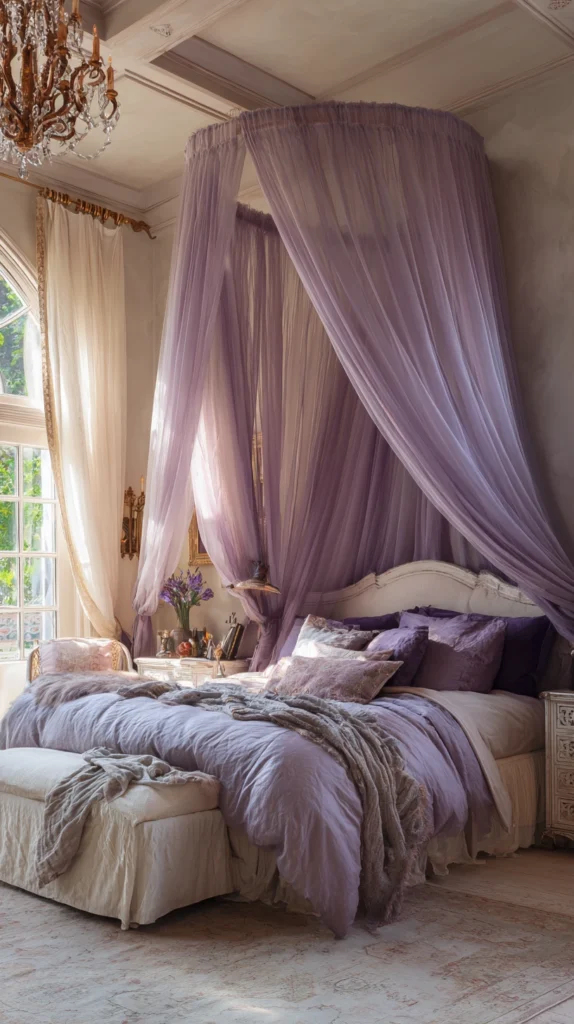 Few things elevate a bedroom’s sense of romance and intention quite like a canopy or bed crown, and in lavender, the effect is genuinely dreamy. A simple wooden or metal crown mounted above the headboard with flowing panels of sheer lavender fabric creates a cozy, intimate sleeping space within the larger room.