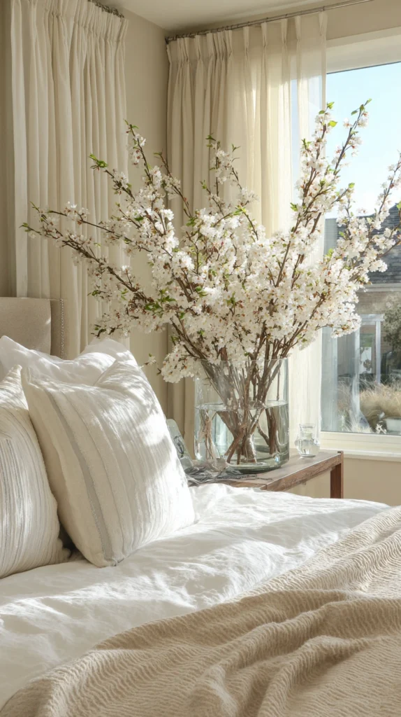 Finally, the simplest and most seasonal idea on this list: cut branches and fresh or faux lavender blooms brought inside and arranged in tall ceramic or glass vases. Cherry blossom branches, eucalyptus stems, or wisteria sprigs alongside bunches of lavender create a bedroom that looks like it was decorated by the season itself.