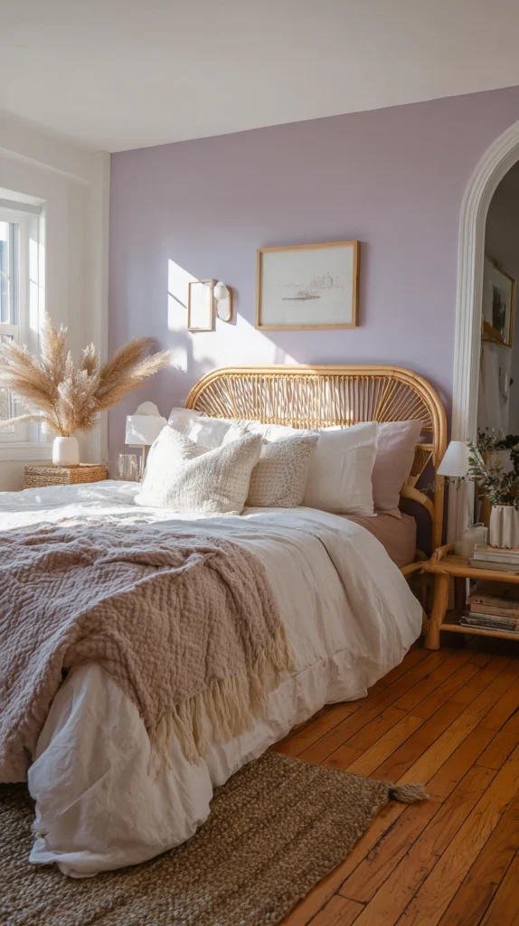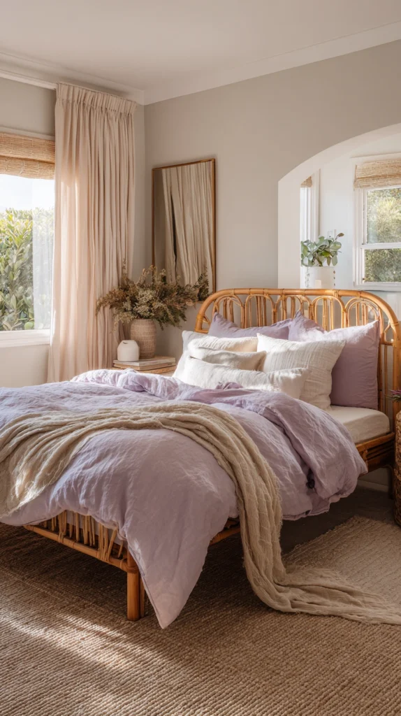A rattan bed frame, side table, or even a simple woven chair paired with lavender cushions, throws, and bedding creates a bedroom that feels both grounded and airy — like a French countryside guesthouse that someone has decorated with genuine care and an excellent eye. Add a few potted plants in terracotta pots to complete the earthy-meets-ethereal aesthetic.