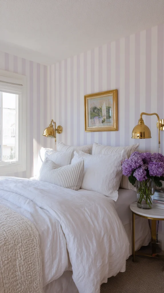 Wallpaper has made a full and confident return to interior design, and nowhere does it feel more at home than in a spring bedroom. A thin lavender and white stripe — vertical, tight, and elegant — brings a classic sensibility to the space without feeling dated.