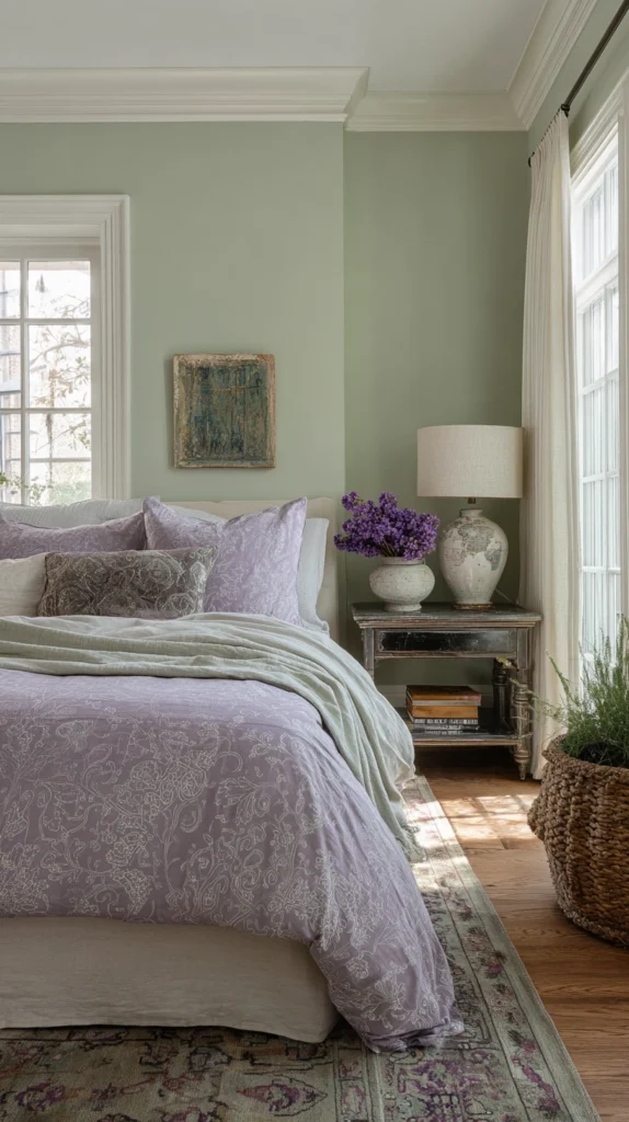 Try lavender bedding against sage green walls, or a sage linen headboard against a soft lavender wall. Add in natural textures like jute, worn wood, and linen to keep the palette grounded. The result is a bedroom that feels grown-up and organic, soft without being saccharine, colorful without being loud.