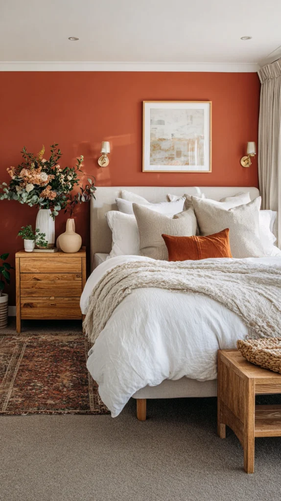 If you’re ready to commit to the color in a big way, a single terracotta accent wall can transform an entire room. Choose a matte or limewash finish to enhance the earthy, organic quality of the shade. This works beautifully behind a bed, sofa, or dining table.