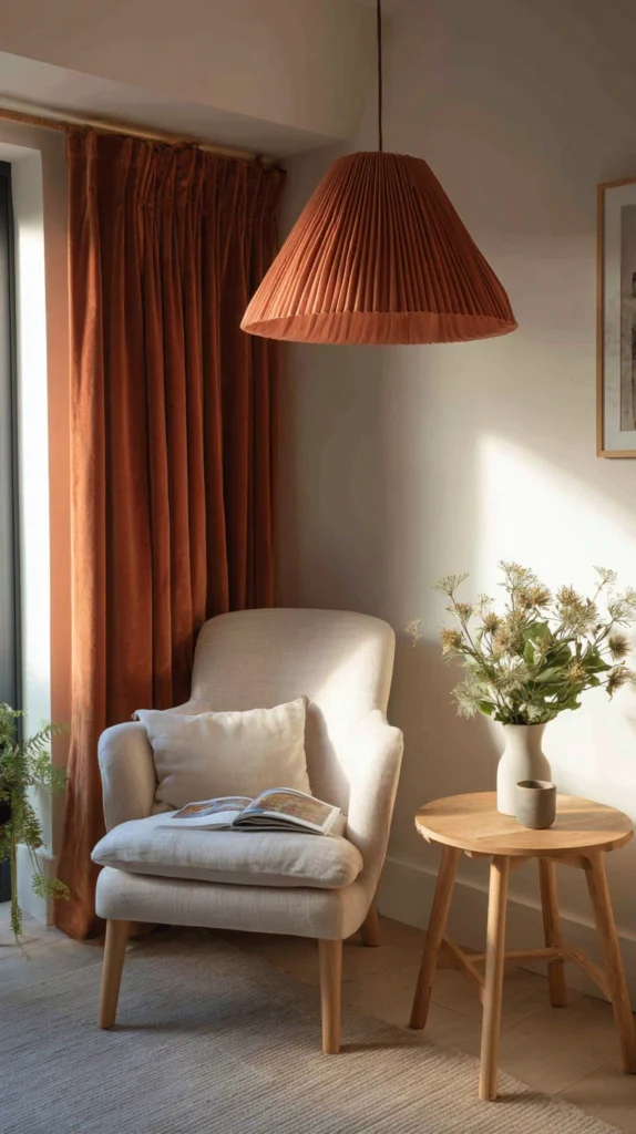 Look for pleated or drum shades in burnt sienna or rust linen, or consider handmade clay pendant lights that glow beautifully when lit. Placed over a dining table or a reading chair, a terracotta light fixture adds warmth, character, and a sense of hand-crafted quality to a space.