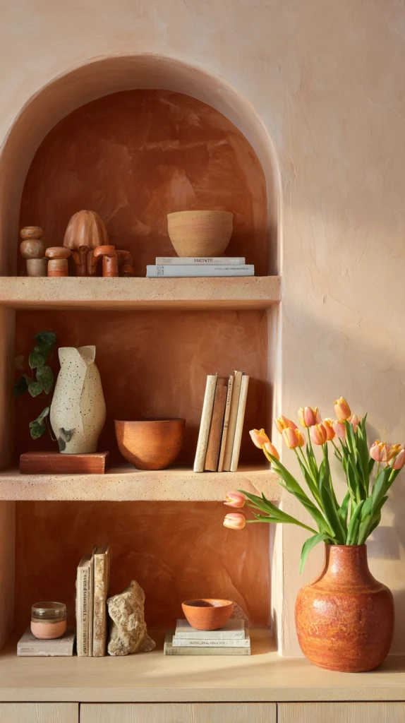 Pair the wall with cream linens, warm wood furniture, and trailing green plants to let the color breathe without overwhelming the space. In spring light, a terracotta wall glows with incredible warmth.