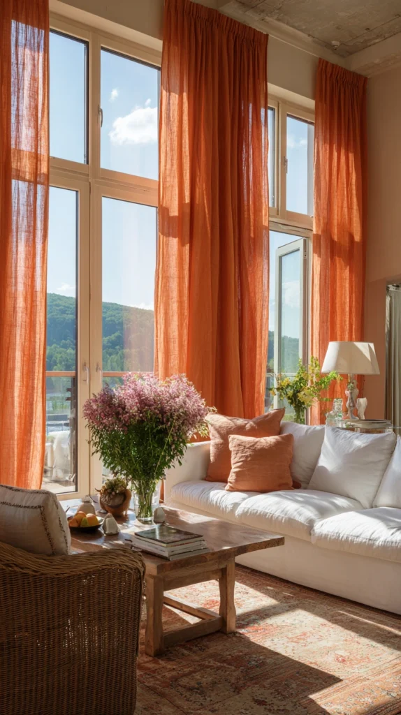 Window treatments are often underestimated as a decor element, but the right curtains can transform a room entirely. Floor-to-ceiling linen or cotton curtains in terracotta, rust, or warm amber tones frame windows beautifully and pool softly on the floor for an effect that’s both casual and luxurious.