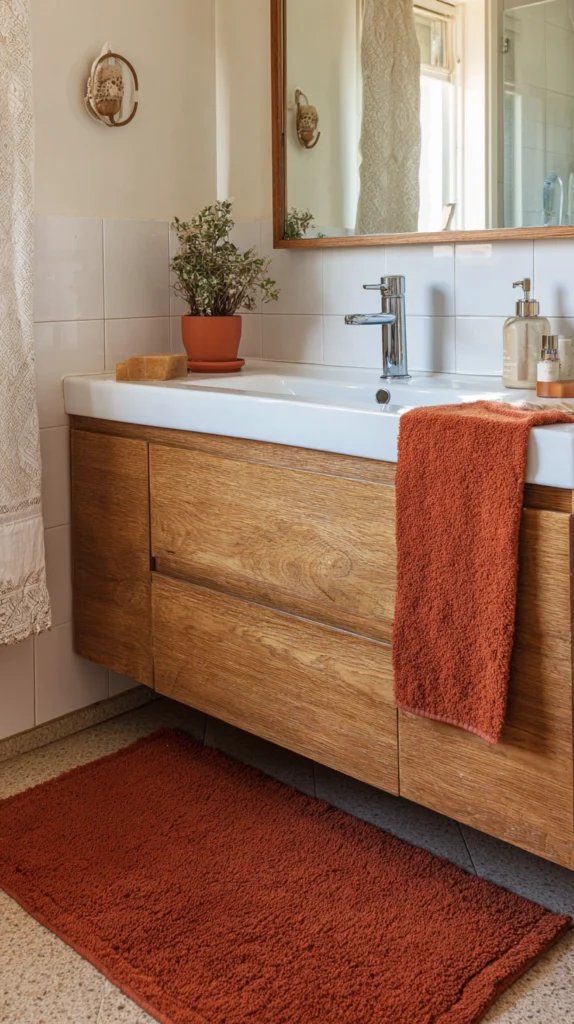 If you prefer something simpler, add terracotta-toned accessories: a handmade clay soap dish, a warm rust bath mat, a terracotta incense burner, and some plants in small clay pots. The combination of terracotta, green plants, and natural wood creates a bathroom that feels like a sanctuary.