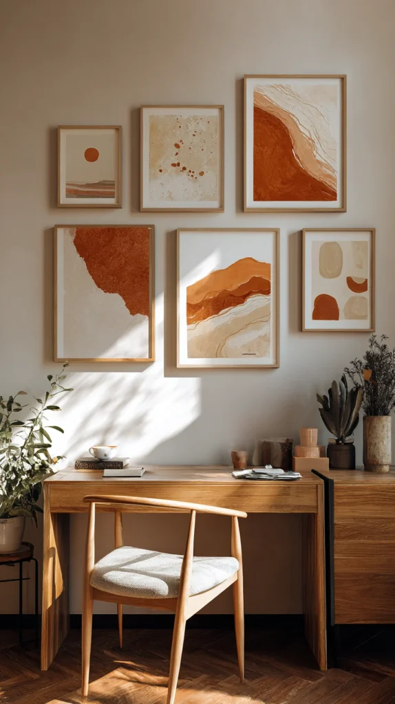 Framed in natural wood or thin brass frames, a gallery wall with terracotta-toned artwork can anchor a room and create a cohesive, intentional look. This works particularly well in entryways and home offices where a strong visual statement makes a big impact.