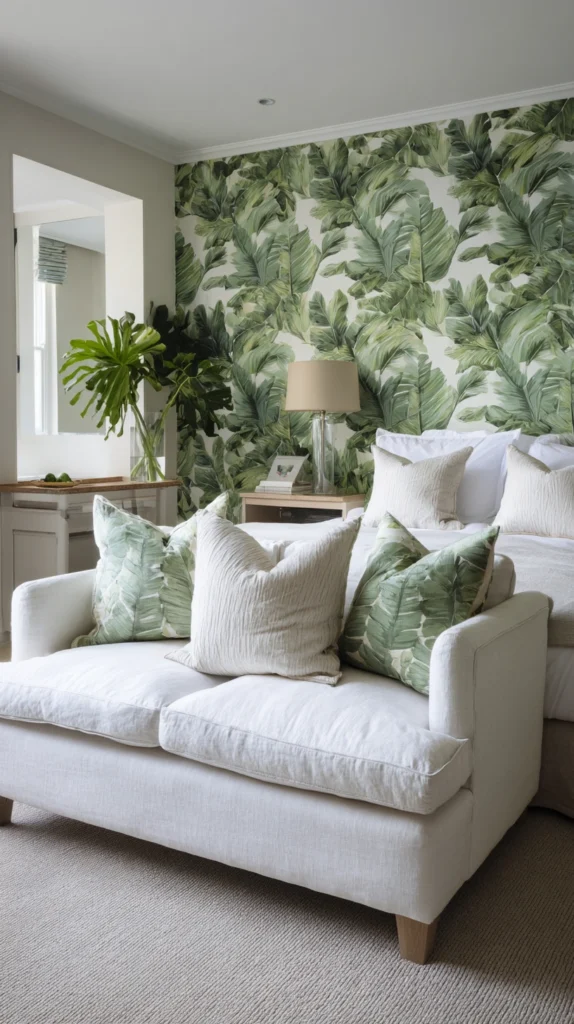 Nothing says spring quite like foliage, and a large-scale botanical leaf print wallpaper on a single accent wall brings the outside in with real drama. Think oversized monstera leaves, tropical palms, or illustrated fern fronds in deep green against a cream or warm white background.