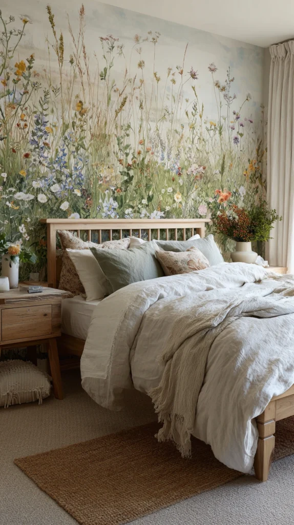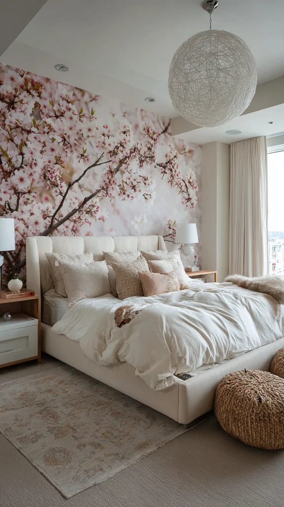 A full-wall cherry blossom mural in a bedroom creates the effect of sleeping under a flowering canopy. Keep the rest of the room simple and restrained so the wall remains the undisputed centerpiece.