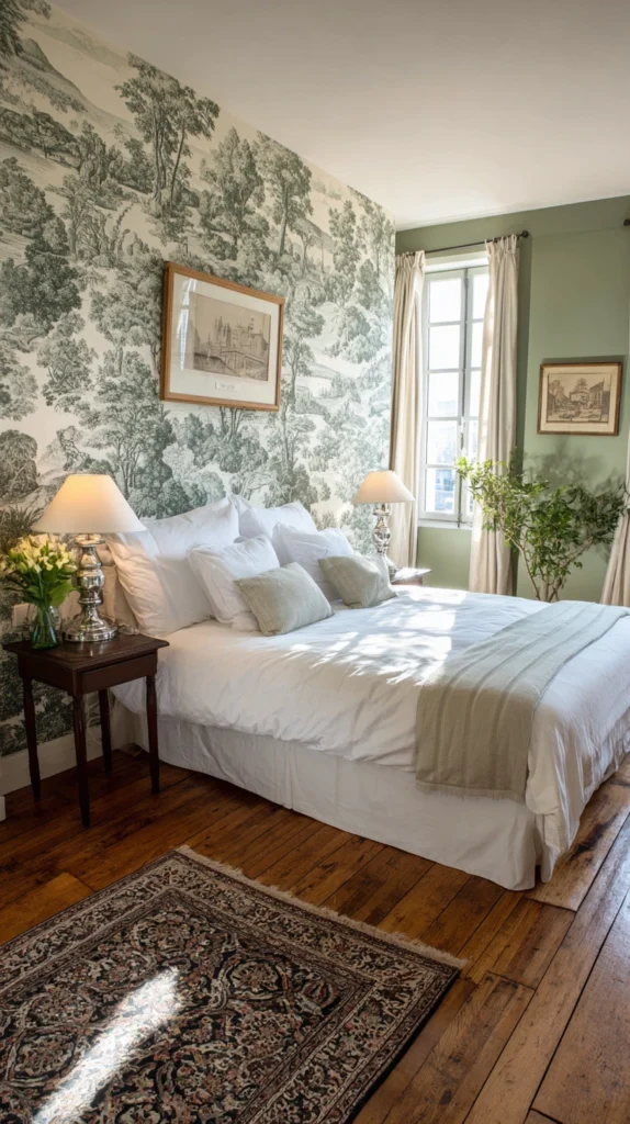 Toile de Jouy is a traditional wallpaper pattern featuring detailed pastoral or romantic scenes rendered in a single color against a plain background. Usually associated with deep red or navy, toile feels entirely reinvented when rendered in spring colorways — soft sage green, dusty blue, or warm terracotta against cream.