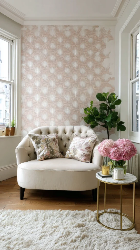 Scallop and arch-shaped wallpaper patterns have had a remarkable moment in recent years, and they suit spring interiors beautifully. The soft, curved geometry echoes natural forms — shells, petals, rippling water — without being overtly representational. In spring palettes of seafoam, blush, warm white, and pale terracotta, scallop wallpapers feel fresh, playful, and modern. They work particularly well in bathrooms, where the pattern’s association with water feels appropriate, and in children’s rooms, where the gentle shapes have a joyful, whimsical energy.
