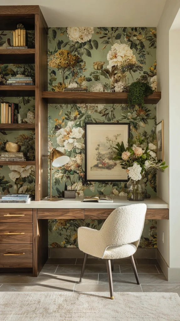 Where botanical prints tend to be bold and graphic, watercolor floral wallpapers are soft, dreamy, and romantic. Loose brushstroke roses, peonies, and wildflowers in blush, lavender, sage, and warm white create an accent wall that feels painterly and light. This style suits bedrooms and reading nooks particularly well, where the softness of the pattern contributes to a feeling of calm and rest. Pair with aged brass fixtures, soft velvet cushions, and warm lighting to complete the mood.