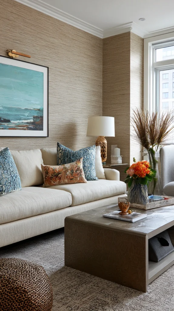 The organic weave catches light differently throughout the day, creating a living, breathing surface that feels deeply connected to the natural world. In warm sand, honey, sage, or natural cream tones, a grasscloth accent wall adds depth and warmth to any room. It is understated, elegant, and particularly beautiful in bedrooms and living rooms with natural light.