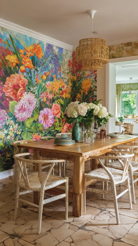 Choose one wall in a dining room or living area and commit to it fully. The trick with maximalist wallpaper is to keep surrounding furniture and decor relatively neutral so the wall has room to do its thing without the room tipping into chaos.
