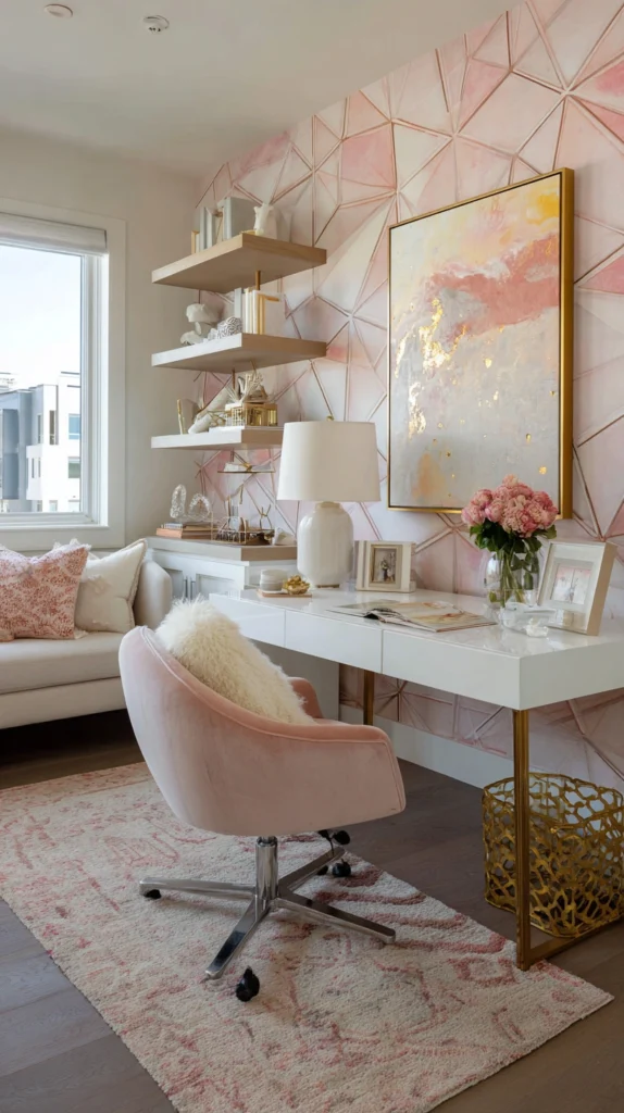 Not every spring accent wall needs to feature flowers or foliage. A geometric wallpaper in a soft spring palette — blush pink, warm cream, dusty mauve, and pale gold — brings freshness through color rather than motif.