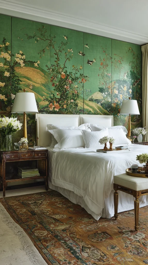For spring, seek out versions in soft jade green, sky blue, or warm blush rather than the deeper winter tones. A chinoiserie accent wall in a dining room or bedroom carries an air of timeless elegance and pairs magnificently with antique mirrors, gilded frames, and dark wood furniture.