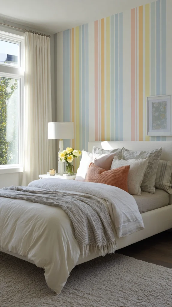 Stripes are one of the most classic wallpaper choices, and in a soft spring palette they feel both fresh and timeless. Vertical pastel stripes — alternating sage and cream, blush and white, or sky blue and warm grey — add height to a room and a quiet rhythm that is pleasing without being distracting.