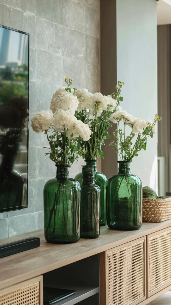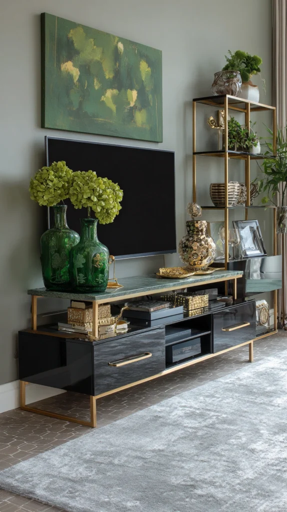 Arrange a collection of green glass bottles in varying heights and shades across your TV console for elegant, understated St. Patrick’s Day style. Use emerald wine bottles, vintage green glass bottles, or modern vases in seafoam and sage tones.