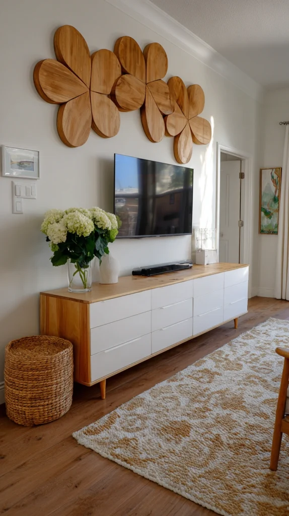 The tiered arrangement draws the eye upward, creating dimension while occupying minimal horizontal space. Rotate items throughout March to keep the display fresh—swap flowers for different varieties, change out figurines, or rearrange the coins. The vertical nature of tiered trays prevents decorations from blocking your television screen, a crucial consideration for this particular surface.