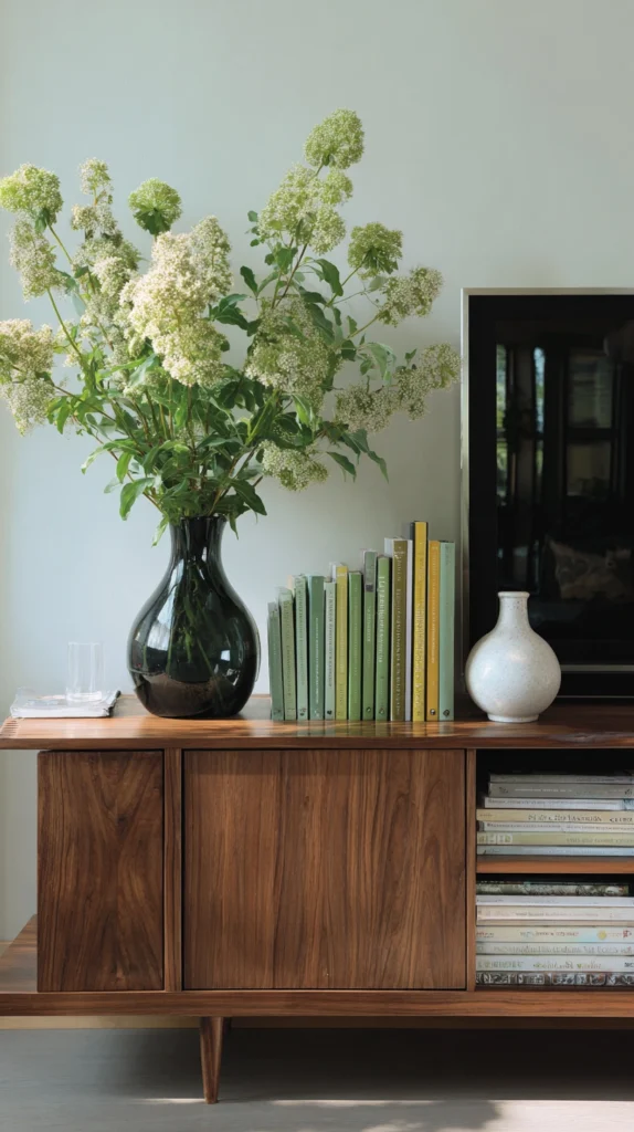 Choose pots in white ceramic, natural terracotta, or metallic gold that complement your console’s finish and your room’s aesthetic. Group three plants together on one side of the console, leaving the other side clear for remotes and practical items.