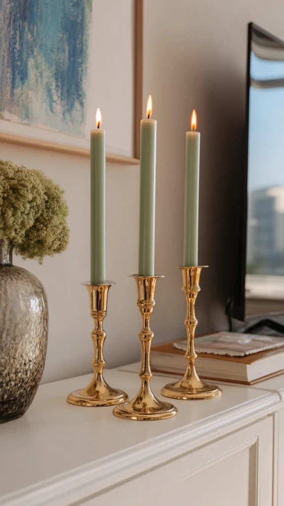 Choose candlesticks in similar styles but different heights—perhaps 8, 10, and 12 inches tall—to create visual rhythm. Battery-operated flameless candles provide the warm glow of candlelight without fire safety concerns, especially important near electronics.