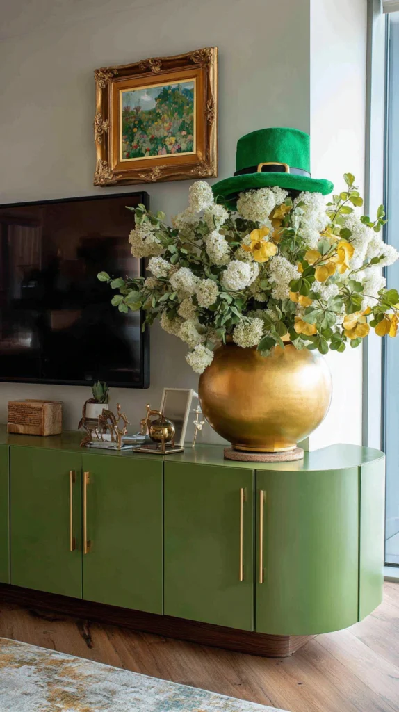 Arrange three gold candlesticks in graduating heights across your TV console, placing pillar or taper candles in green, white, or cream on top. The candlesticks represent the legendary pot of gold while adding elegant vertical elements that don’t obstruct screen visibility.