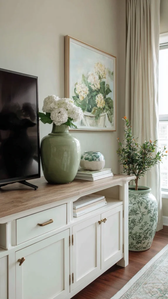 When decorating your TV console, maintain clear sight lines to your television screen. Avoid placing tall items directly in front of the screen or arrangements so wide they encroach on viewing angles.