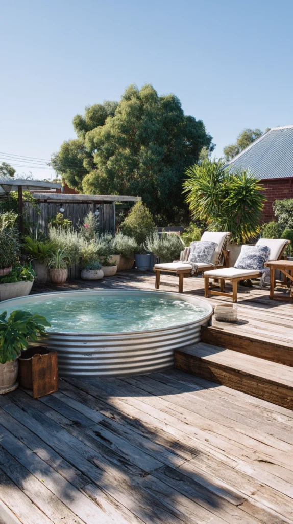 The most classic setup — a large galvanised steel trough positioned on a simple low timber deck with the deck surface extending around the tank to create a surrounding lounge and entry area — creates a pool feature of considerable rustic charm. The timber deck frames the tank as a deliberate design feature and creates the poolside space that makes lounging comfortable and natural. The contrast between warm timber and industrial galvanised steel creates a material pairing of considerable visual character.