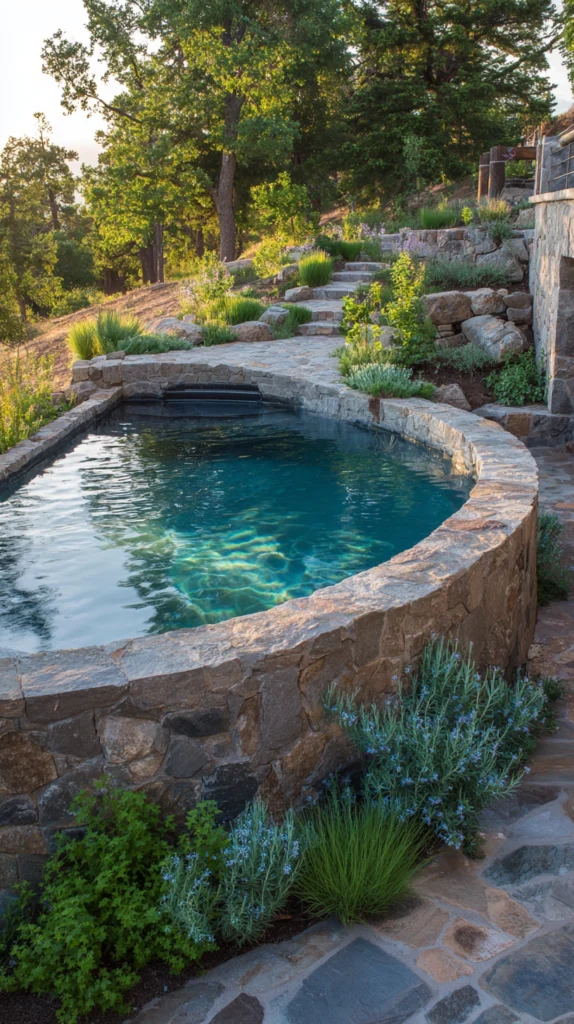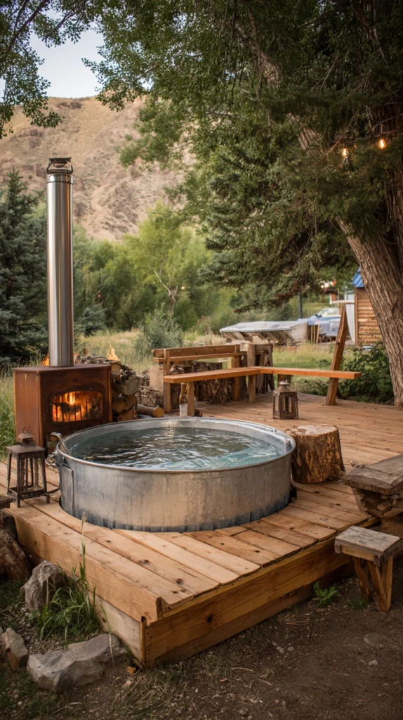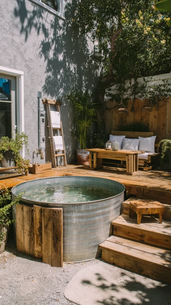A stock tank converted to a hot tub — heated with a purpose-built wood-fired or electric stock tank heater — creates a warm water soaking experience at a fraction of the cost of a conventional hot tub. The stock tank hot tub transforms the pool from a warm-weather feature into a year-round outdoor wellness installation. Add a simple timber surround, a removable insulating cover, and poolside seating for a complete hot tub experience.