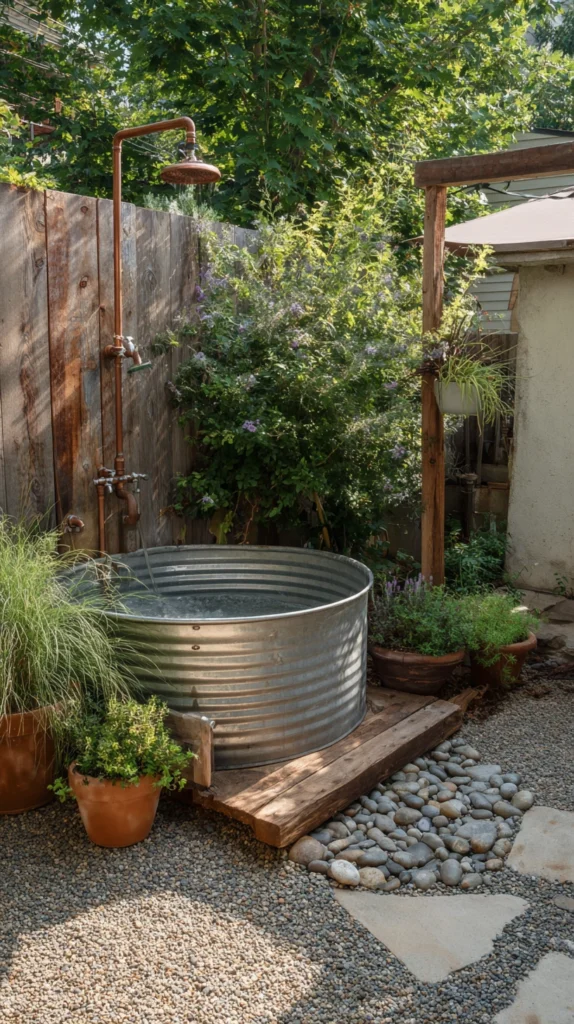 Adding a simple outdoor shower adjacent to the stock tank — a freestanding copper pipe or timber frame shower connected to the garden hose or household cold water supply — creates a pool installation of genuine practical completeness. The outdoor shower provides the pre-swim rinse and post-swim cool-down that makes a small pool significantly more hygienic and more enjoyable to use consistently throughout the season.