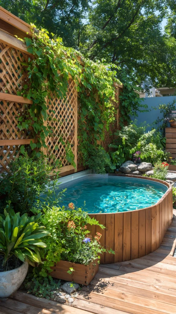 A stock tank pool enclosed on one or more sides by a decorative privacy screen — a timber lattice panel, a stretched sailcloth screen, or a living green wall of climbing plants — creates a pool installation of genuine privacy that makes the area feel like a dedicated retreat.
