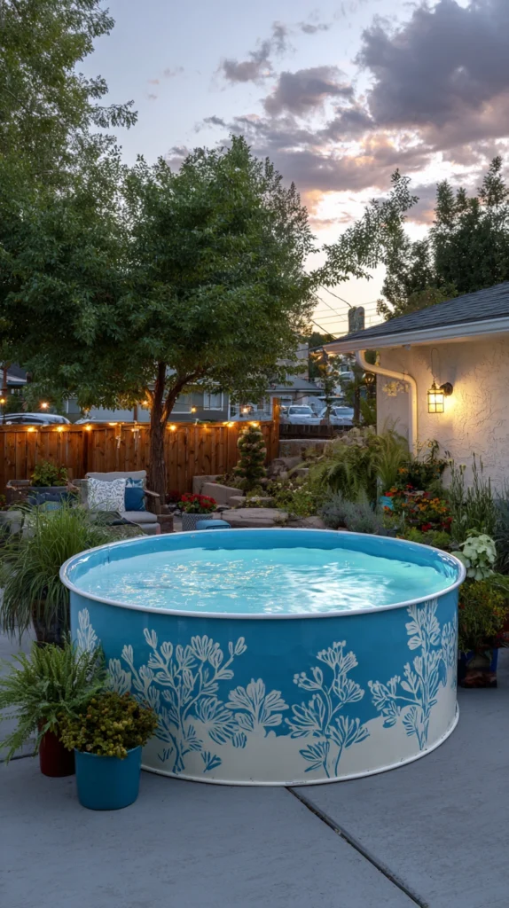 A stock tank personalized with painted exterior decoration — stencilled botanical patterns, hand-painted geometric designs, painted tropical foliage, or simply the family name in hand-lettered script — transforms an anonymous agricultural object into a completely individual backyard feature of genuine personal character.