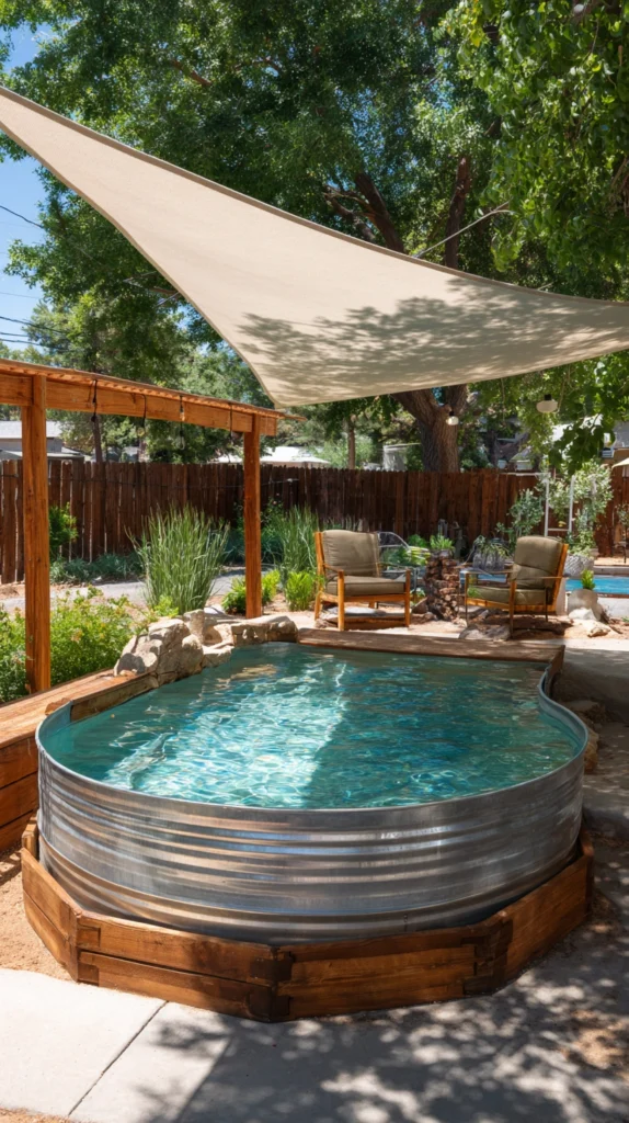A stock tank positioned beneath a tensioned shade sail creates a pool installation of genuine comfort and considerable visual elegance. The sail provides essential protection from direct overhead sun — reducing UV exposure and slowing algae growth — while creating a defined overhead plane that gives the pool area a room-like enclosure. Choose a fabric with a UPF 50+ rating in a color that complements the garden palette.