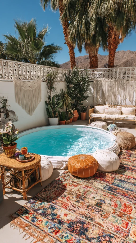 Pro Tip: Choose weatherproof versions of all boho textile accessories — outdoor-rated kilim rugs, solution-dyed cushion covers, and UV-stabilised macramé. Standard indoor boho textiles deteriorate rapidly poolside — fading, developing mildew, and losing their quality within a single season. Outdoor-rated alternatives maintain their appearance through many seasons of pool use.
