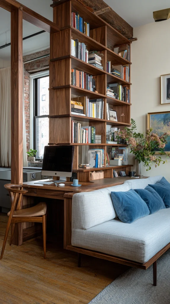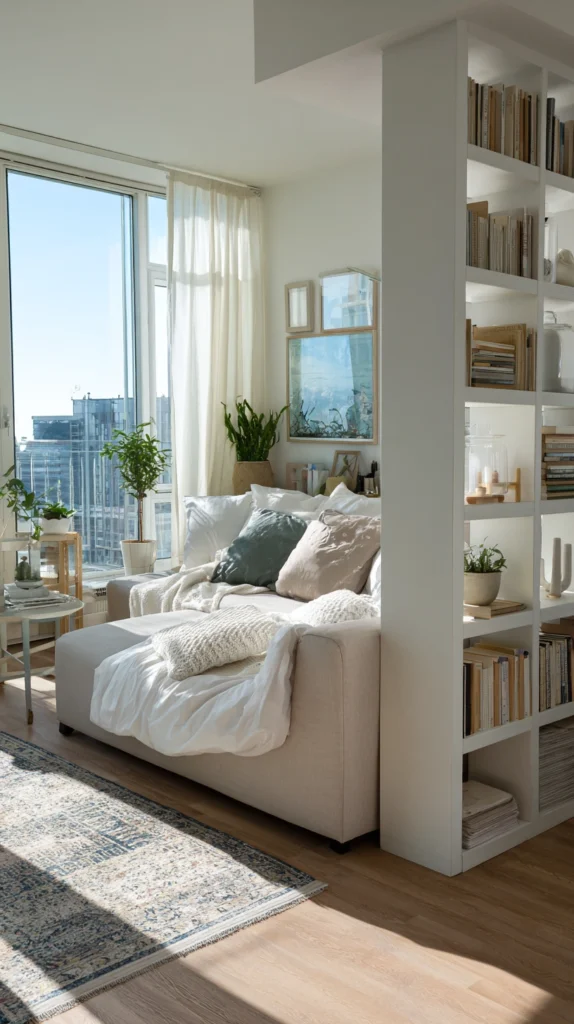 The freestanding bookcase used as a room divider is the studio apartment solution that has stood the test of time most convincingly, and its continued relevance reflects the fact that it solves multiple problems simultaneously with a single piece of furniture.