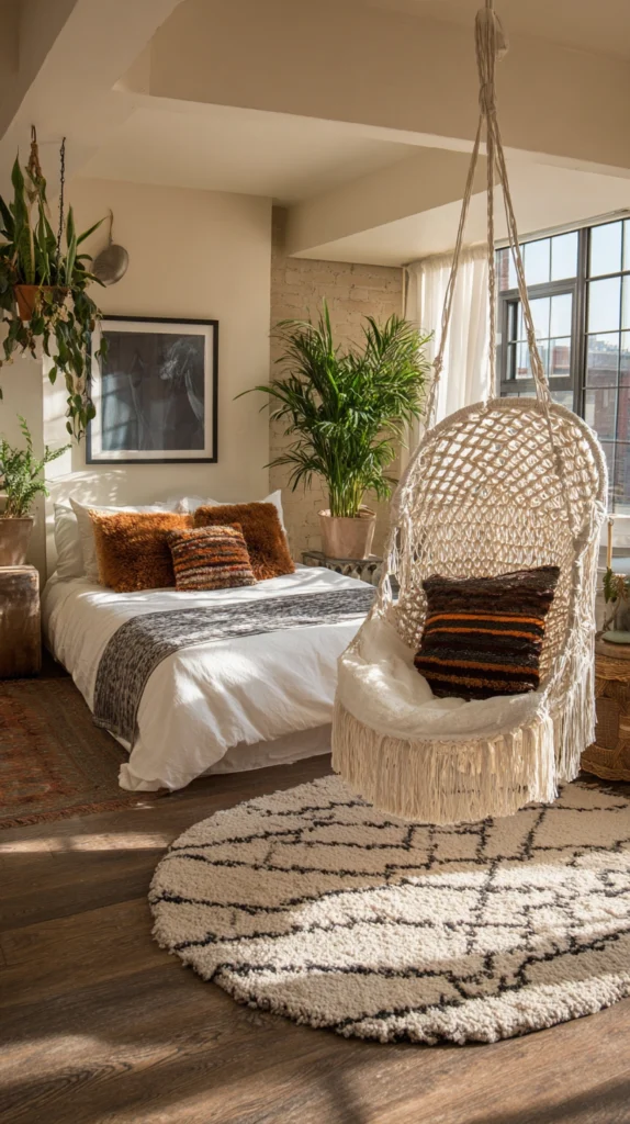Large-format macramé or woven textile hangings suspended from a ceiling-mounted dowel or rod are enjoying a significant design revival, and in a studio apartment context they offer a dividing function alongside their undeniable decorative presence.