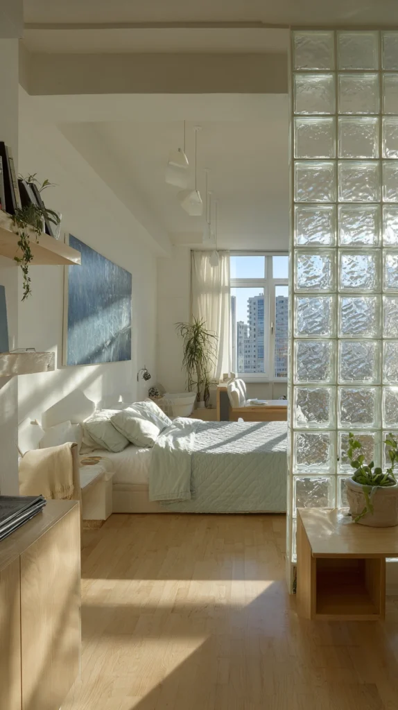 Glass block walls — constructed from translucent glass units mortared or clipped together into a panel — bring light through a partition while providing visual privacy, making them one of the few genuinely solid divider options that does not compromise the studio’s relationship with natural light. A partial glass block partition — rising from floor to counter height or from floor to chest height — between a kitchen and living zone, or between a sleeping area and the rest of the studio, allows light to travel through the partition from whichever zone is brighter at any given time of day, effectively distributing natural light more evenly through the studio than a solid partition would permit.