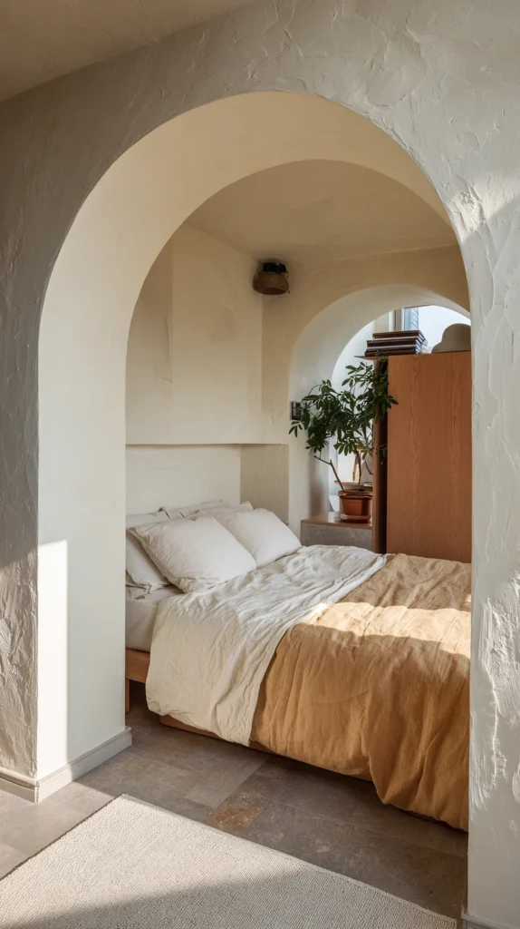 A partial wall rising to approximately two meters, with an arched opening cut through it at the boundary between sleeping and living zones, creates genuine spatial separation without full enclosure — the arch allows visual connection, light transmission, and movement between zones while the wall provides the acoustic and psychological separation that a studio without partitions cannot offer.