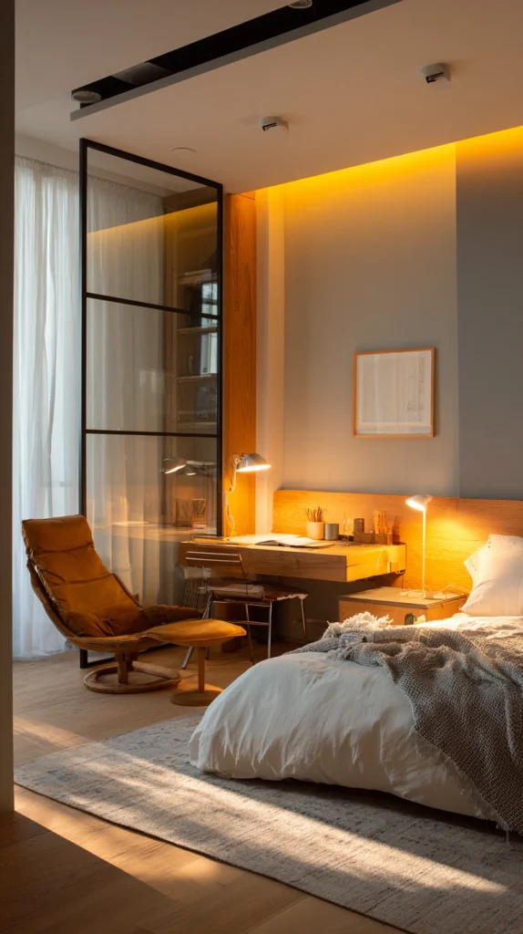 In the evening, a sleeping area lit only with a bedside lamp in a warm tone feels entirely separated from a living area lit with string lights and a floor lamp, even though there is nothing between them. Light, used deliberately and with understanding of its spatial power, is the most elegant and most invisible room divider available.
