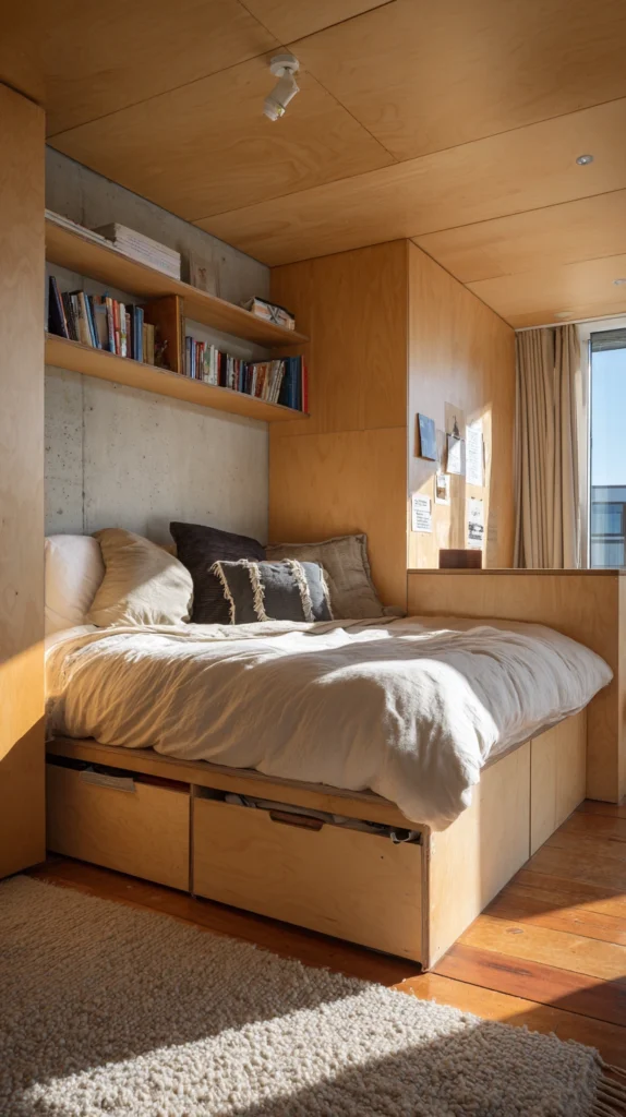 The platform itself can incorporate storage drawers in its base, making it simultaneously a spatial divider and a storage solution, and its edges can serve as informal seating for the living zone below. The platform should be clearly defined in its material — a different timber species, a different floor covering, a change from the main studio floor — so that the distinction between the two levels is visually reinforced as well as physically experienced.